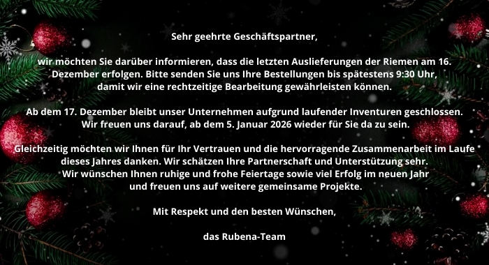 - Rubena ist ein traditioneller tschechischer Hersteller von Keilriemen mit einer langen Geschichte. Wir bieten zuverlässige Qualität und günstige Preise. Wir arbeiten weiterhin auf gegenseitiges Vertrauen mit unseren Kunden hin, die Lieferungen erfolgen sowohl auf den inländischen Markt als auch ins Ausland. Rubena-Riemen mit ihrer breiten Palette und verschiedenen Materialausführungen können in modernen Industriemaschinen, landwirtschaftlichen Geräten und verschiedenen anderen Anwendungen der heutigen schnelllebigen Welt eingesetzt werden.